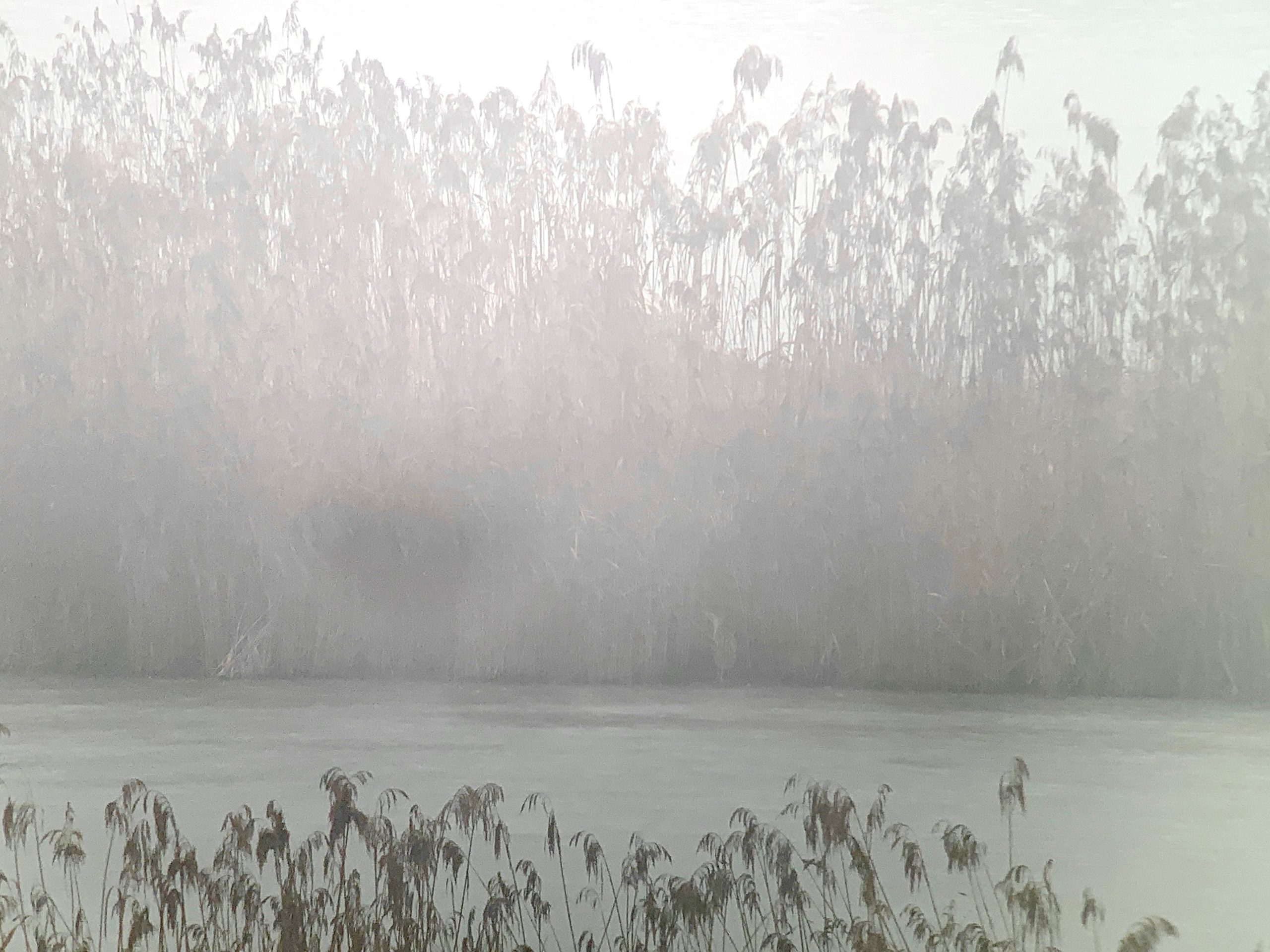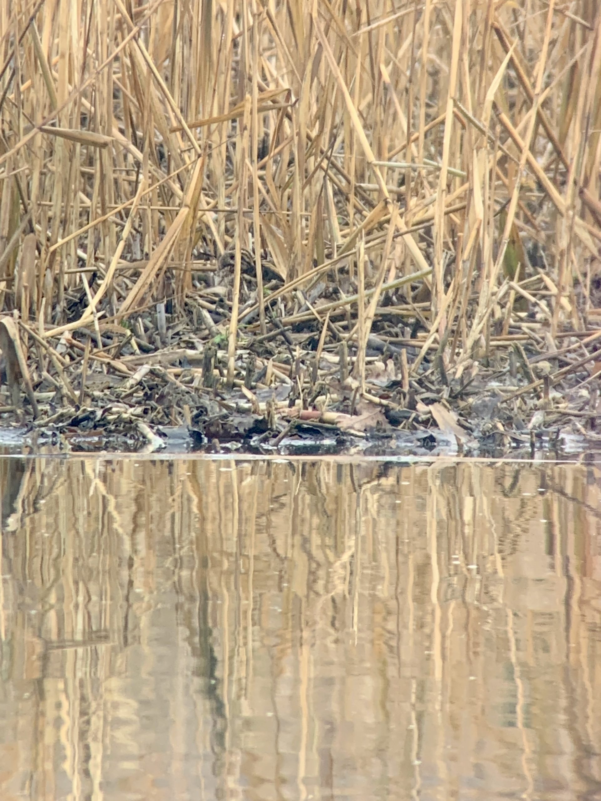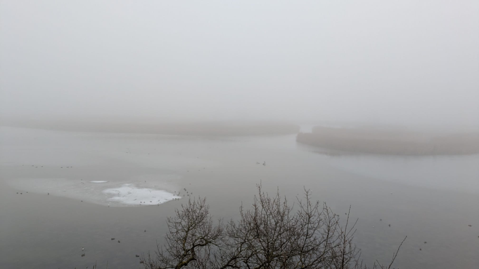 Nach der Stärkung mit Kaffee, Tee und Kuchen wagten wir uns wieder nach draussen. Der Nebel hatte sich immerhin etwas verzogen und so konnten wir auf den Beobachtungsturm gehen. Dort tümmelten sich viele Enten und Blässhühner. Ganz hinten entdeckte Steffi plötzlich eine Rohrdommel! Sie schlitterte über das Eis und verschwand danach wieder im Schilf.